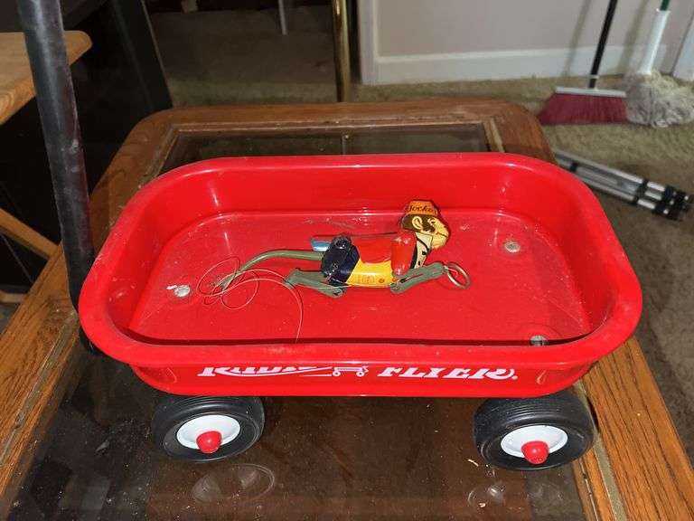 Newer Radio Flyer wagon with plastic wheels and tongue (12.5"Lx7.5"W), wheels are 3". Also a Line Mar toy called Jocko the Flying Monkey, works