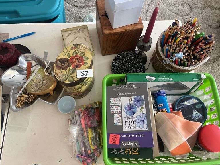 Misc Lot of Colored Penclis and Pens and Books and Tissue Boxes and More