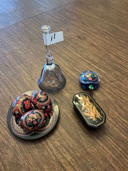 Hand Painted Russian Easter Eggs and a Glass Bell and a Collectible Multi Colored Turtle and More