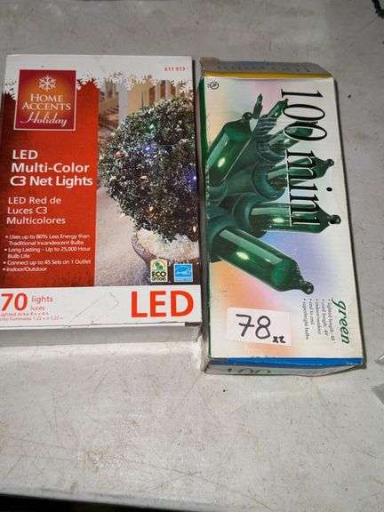 2 Boxes of Christmas Lights . The first one is LED Multi-color C4 lights, 70 lights in the box, connects up to 45 sets on 1 outlet, indoor/outdoor. 100 Mini green lights, lighted length 48', cord length 49', indoor/outdoor, end to end, super bright bulbs.