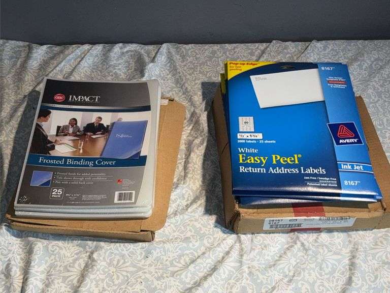 5 boxes of White Easy Peel with Return address labels. 2000 Labels and 25 sheets 1/2 in x 1 3/4in. 80 labels per sheet. 4 packs with 23 sheets of Impact Presentation Solutions Frosted Binding Cover 8-3.4inx11-1/4in.