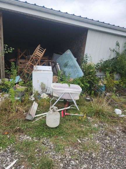 Clean out of the right side of the lean to, wheels, car doors, bedframe, dryer, shelving unit and more