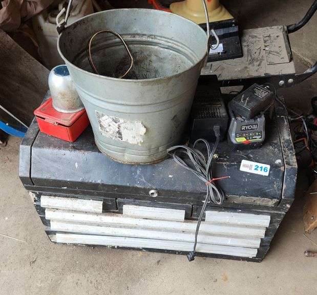 Empty tool box, Ryobi and Craftsman chargers, bucket with misc items in it, and more