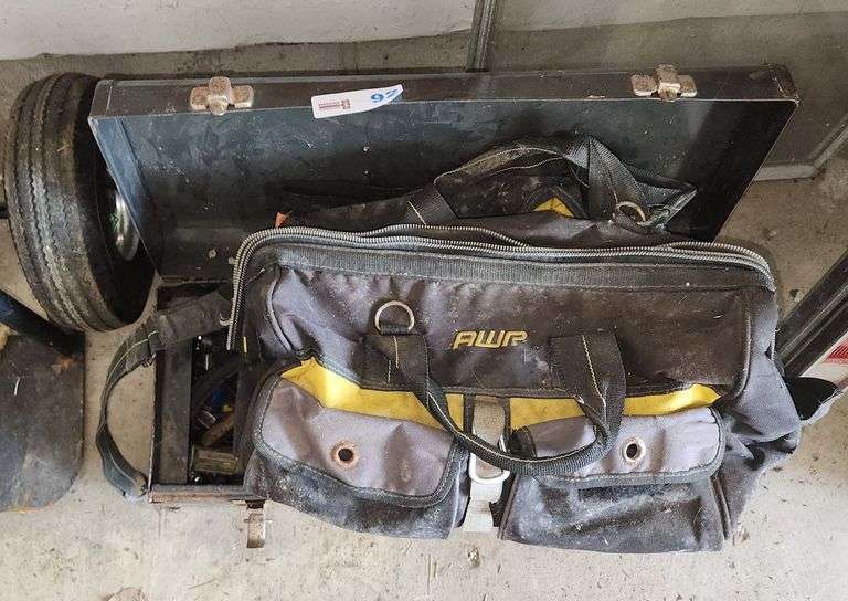 Tool box with a small amount of tools, bag with some tools and more
