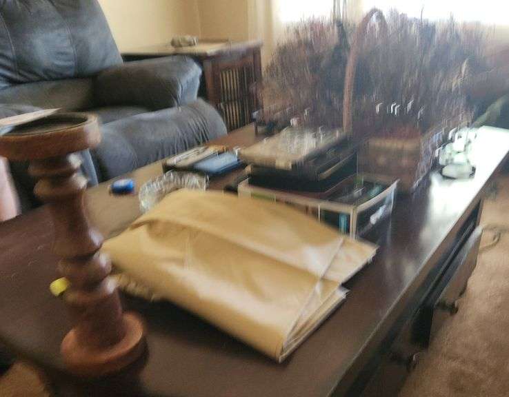 Coffee table clean off of all items, candle holder, flower basket, wires, ash trays, scale, Beegee CDs