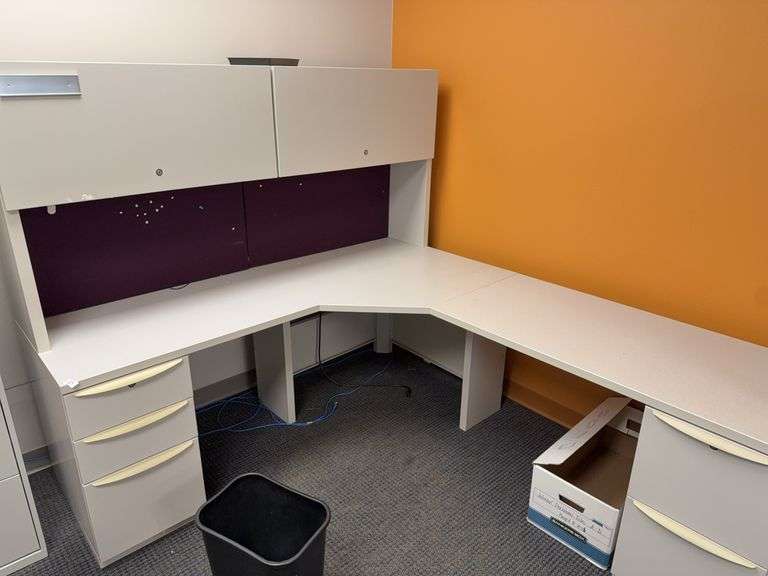 L-Shaped office desk with a topper and drawers.