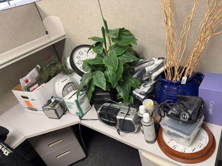Office clocks, radio, silk florals, decorative vases, Fan and more
