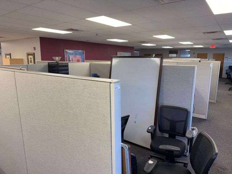 Two work station cubicle office system. All inside and outside walls, 189" x 90" inches x 64 inches tall. All walls, desks, cabinets and file drawers included but no office supply contents. Corner receptionist desk as well.