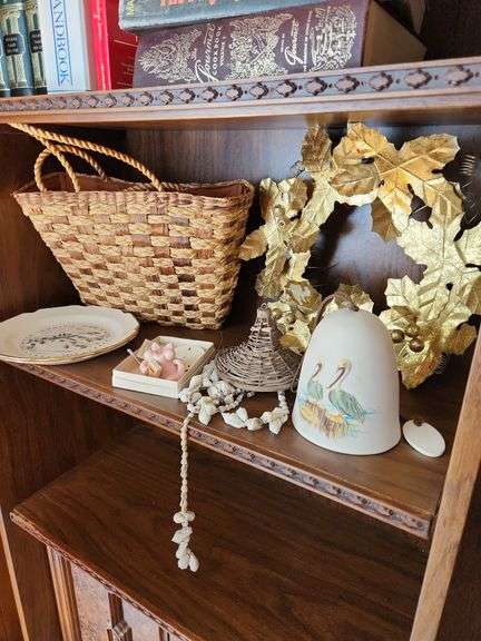 Straw Purse, 2 Wind Chimes, 2 Decorative Plates, Gold Colored Metal Wreath, and More
